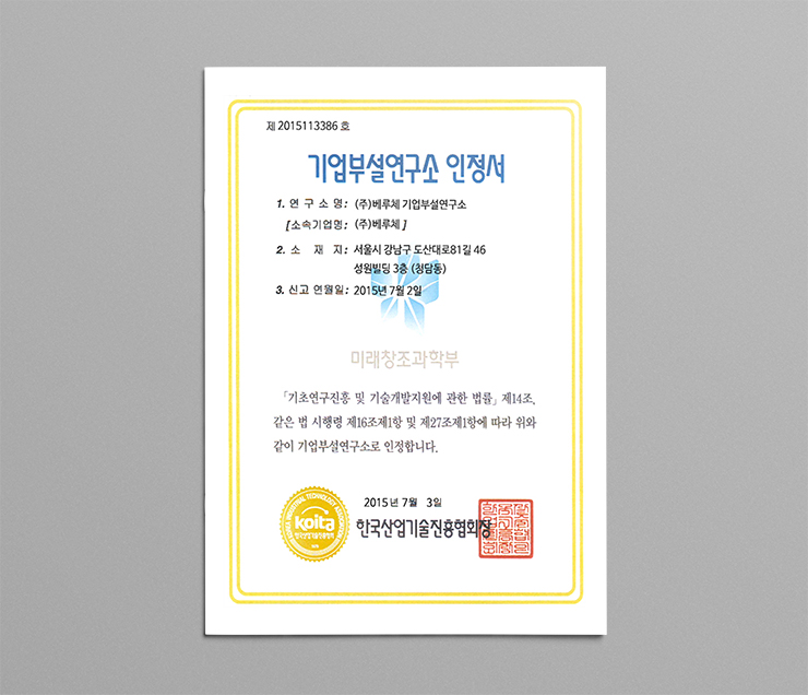 베루체는 자체 제작 공방외에 주얼리 제작 기법과 디자인을 연구하는 연구소를 별도 운영하고 있었는데 7월 3일 (사)한국산업기술진흥협회에서 인정하는 기업 부설 디자인 연구소에 인증을 받았습니다.